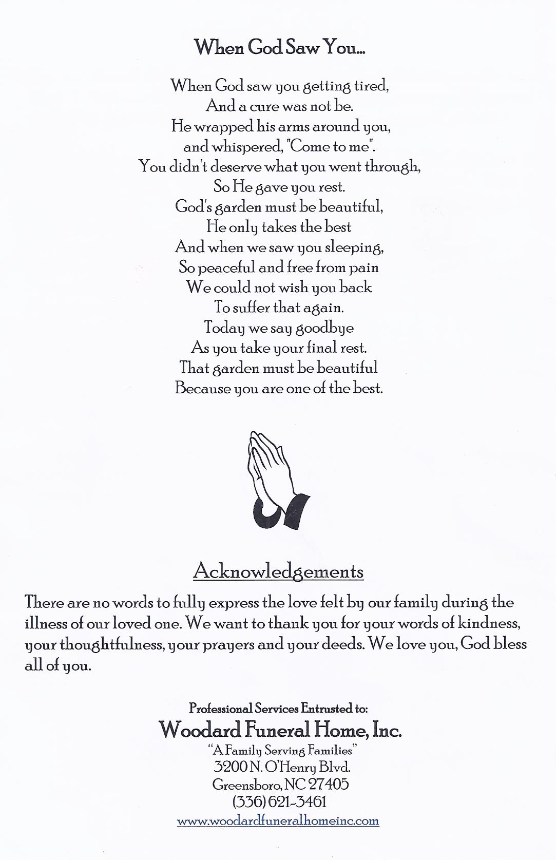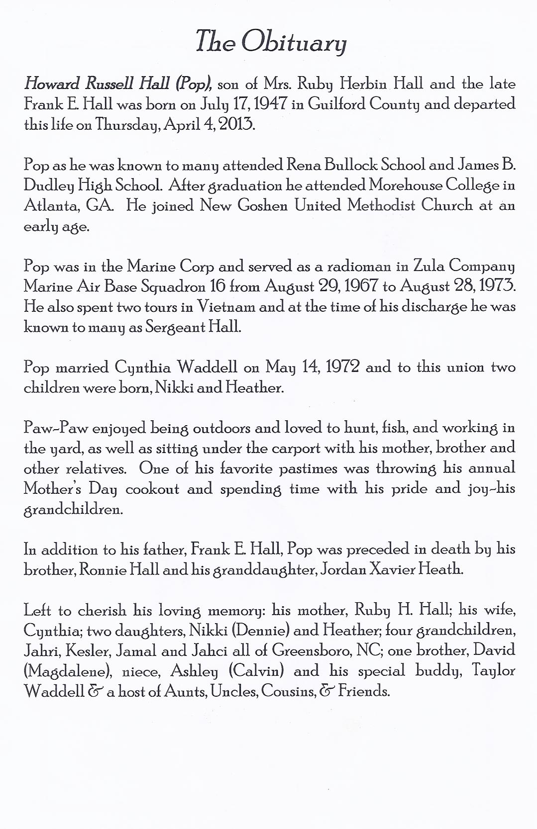 "When I heard the sad news about my good ole' childhood friend, I was saddened. Then I thought of all the good times we had at Rena Bullock. You, my friend 'Pop', were my Hokee Pokee partner during all the dances at school. Both of us were about two feet tall and trying to dance. You were always next to me during picture time. I remember, the last time I saw you at our 45th reunion from Dudley, the photographer asked you to stand next to me. I told you after all these years you were still next to me when pictures were taken. I didn't get a chance to see you much after I left Greensboro, but I always asked about you. So my dear friend, I will always remember the good times we had. God took you home to take you away from pain and suffering."